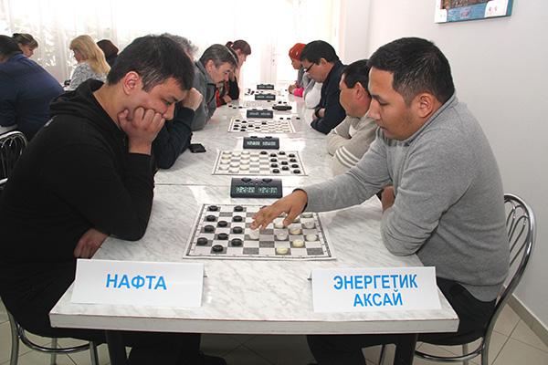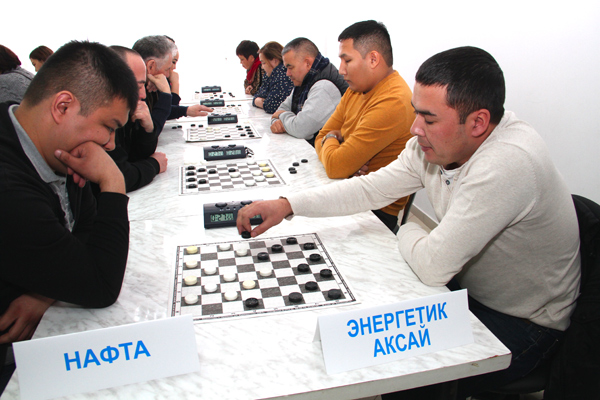 Сотрудники АО ''АГПЭ'' в команде ''Энергетик-Аксай'' участвуют в соревнования по шашкам из программы XX спартакиады ''Здоровье''. На переднем плане М.Ергалиев. Январь 2020 г.