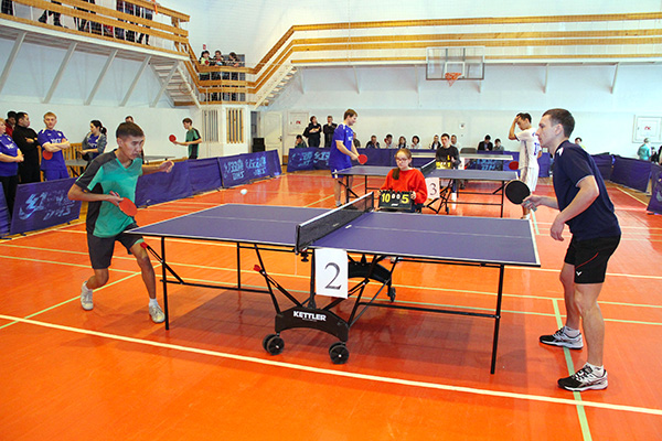 Соревнования по настольному теннису из программы XVIII спартакиады ''Здоровье''. В игре участник команды ''Энергетик-Аксай'' Б.Калиев (слева). Февраль 2018 г.