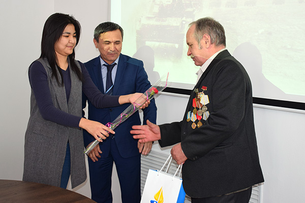 Ежегодное чествование воинов-интернационалистов - сотрудников ГК ''Конденсат''. Генеральный директор АО ''АГПЭ'' А.З.Абзалилов поздравляет воина-интернационалиста - тракториста и слесаря А.А.Серегина. Февраль 2018 г.