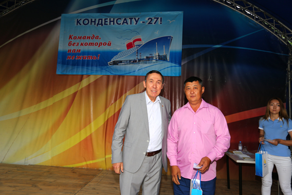 Председатель Совета ГК ''Конденсат'' В.К.Джунусов вручает Памятный знак ''Конденсат'' III степени автокрановщику АО ''АГПЭ'' С.У.Баймагамбетову. День Конденсата, июнь 2019 г.
