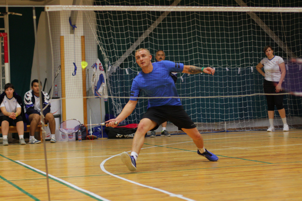 Соревнования по бадминтону в парном разряде из программы XIX спартакиады ''Здоровье''. Честь команды ''Энергетик-Аксай'' защищает смешанная пара С.Самарцев /Е.Самарцева. Апрель 2019 г.