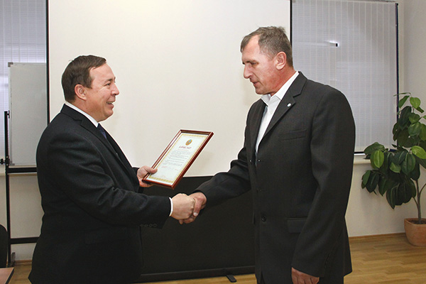 Член Совета ГК ''Конденсат'', депутат областного маслихата Ф.Н.Бахтиозин вручает Благодарственное письмамо заместителя акима Западно-Казахстанской области бригадиру операторов котельной И.В.Смилину. Декабрь 2016 г.