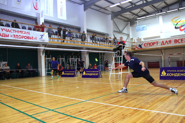 Соревнования по бадминтону в парном разряде из программы XVIII спартакиадф ''Здоровье''. В игре пара Д.Рублев/Р.Мокшин. Апрель 2018 г.
