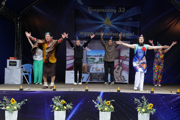 Не обошлось и без традиционного «капустника». «Конденсату 33 – ждут нас новые пути» — таким стал девиз всего праздника, и коллективы предприятий постарались подготовить свои номера согласно заданной тематике. Открыл музыкально-театрализованное представление яркий номер детского хора, участники которого, дети и внуки сотрудников ГКК, исполнили песню «Мы такие разные». А дальше поезд времени Группы компаний отправился по маршруту «Аксай-Мечта», и проводник в исполнении Романа Колесникова, сотрудника отдела снабжения АОК, объявил первую станцию, то есть номер от виновников торжества. В театрализованной сценке, которая носила юмористический характер, актёры вспомнили о трудностях начала создания завода, об этапах развития, о взлётах и падениях и о том, что надежда на светлое стабильное будущее никогда не покидала сердца конденсатовцев. Итогом стала коллективное исполнение песни «Всё нормально у Конденсат».