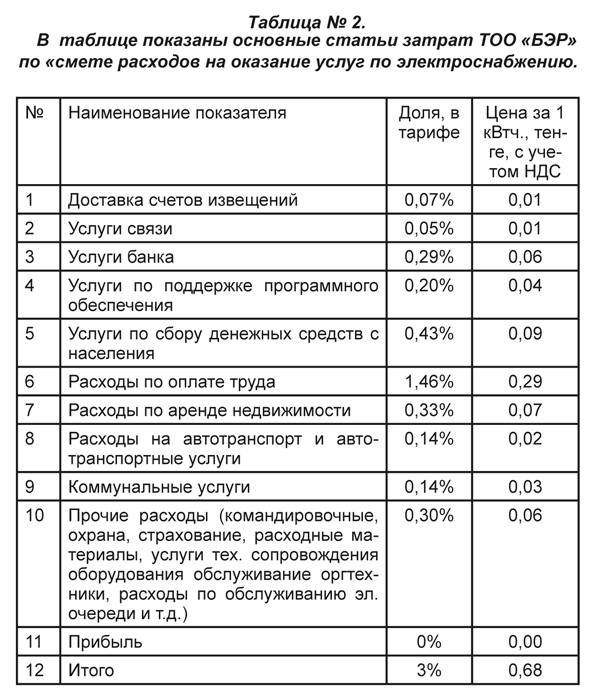 - 3% в утверждённом тарифе «БЭР» или 0,68 тенге, составляет снабженческая надбавка. Это те средства, которые необходимы для организации работы предприятия (см. таблицу №2 – ред.).