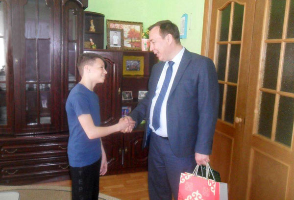 Поздравить именинника приехал депутат областного маслихата, председатель Совета директоров АО «Конденсат» Фарид БАХТИОЗИН. К слову, вот уже 15-й год конденсатовцы не оставляют без внимания ребят из Детской деревни в дни их именин, а также поздравляют с началом учебного года, Новым годом, Днем защитников детей и другими праздниками. С пожеланиями здоровья и успехов в учебе Фарид Наильевич вручил виновнику торжества спортивные кроссовки и футболку.