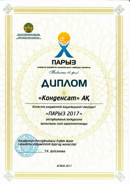 1 марта, в день Благодарности, АО «Конденсат», которое первым в стране начало выпускать бензин экологического класса К5, удостоилось диплома от министерства труда и социальной защиты населения РК за участие в республиканском конкурсе по социальной ответственности бизнеса «Парыз-2017».