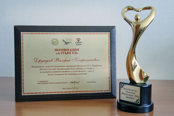 - Решением специальной комиссии под председательством заместителя акима области Г. Оспанкулова победителем в номинации «Золотое гнездо» по праву был признан Валерий Кинжегалиевич, возглавляющий еще и Региональный совет Палаты предпринимателей ЗКО, - сказала председатель ассоциации «Болашак» Салтанат ТУМАНБАЕВА. – Благодаря его активному стремлению участвовать в решении общих проблем нашего региона и страны в целом ежегодно выделяются финансовые средства на развитие социальной сферы, поддержку спорта, образования, здравоохранения и культуры, оказывается помощь детям с ограниченными возможностями, а также оставшимся без попечения родителей, матерям-одиночкам и детским домам.
