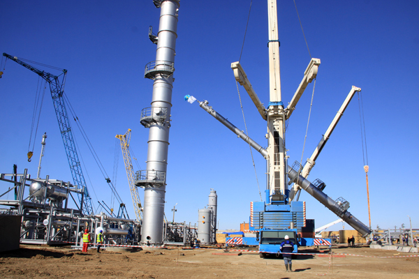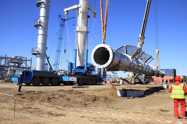 Для этих целей из совместной российско-голландской фирмы «MAMMOET RUSSIA», специализирующейся на тяжелых подъемных работах и транспортировке грузов большой тяжести были приглашены бригады, работающие на кранах грузоподъемностью 700 тонн и вылетом стрелы в оснащенном виде до 120 метров (основной) и 200 тонн с вылетом стрелы в оснащенном виде до 110 метров. Краны с меньшей грузоподъемностью при вертикальном подъеме такого крупногабаритного груза, как технологическая колонна, могут опрокинуться. В воскресенье была установлена на фундамент первая технологическая колонна высотой более 50 метров и весом порядка 70 тонн. В понедельник установлена вторая из семи технологических колонн высотой 40 метров (на фото).