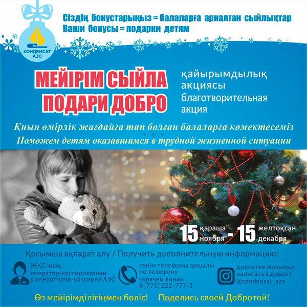 Акция была запущена в 2021 году и уже стала доброй традицией ТОО «Конденсат-АЗС». Ее целью является подарить праздник тем детям, которые, скорее всего, будут обделены подарками в Новогоднюю ночь. Это ребята из малообеспеченных и многодетных семей, дети из Дома малютки.
