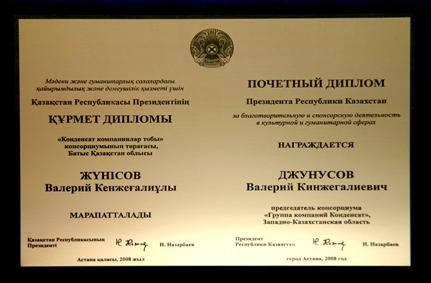 Группа компаний "Конденсат" в лице ее первого руководителя Джунусова В.К. в последнем месяце уходящего 2008 года была награждена Почетным дипломом Президента Республики Казахстан Назарбаева Н.А за благотворительную и спонсорскую деятельность в культурной и гуманитарной сферах. Инициатива участия нашей компании на получение столь высокой награды исходила от Министерства культуры и информации.