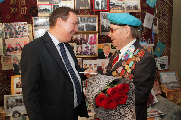 По случаю столь значимого мероприятия Григория Филатовича - недавно он перенес операцию на глазах, но врачи отпустили фронтовика домой, чтобы смог пообщаться с близкими и друзьями, принять поздравления - от лица всех коллективов Группы компаний и от имени председателя Совета ГКК Валерия Джунусова поздравил председатель Совета директоров АО «Конденсат», депутат областного маслихата Фарид Бахтиозин: