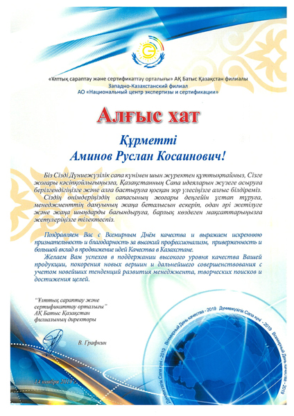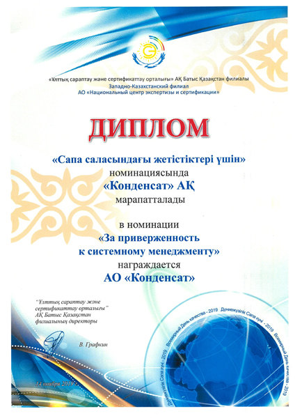 За вклад в развитие отечественной экономики, приверженность делу повышения качества выпускаемой продукции АО «Конденсат» получил награду от ЗКФ АО «Национального центра экспертизы и стандартизации» – Диплом в номинации «За приверженность к системному менеджменту». Кроме того, Благодарственным письмом за высокий профессионализм и большой вклад в продвижение идей Качества в Казахстане был награжден главный технолог – начальник технического отдела Аминов Р.К.