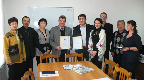 Эксперт-аудитор Мырзагалиев А. вручает сертификат соответствия СТ РК ИСО 9001-2009